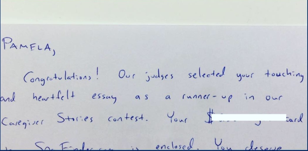 The above is what I wrote with my picture post on Instagram. I was quite surprised to receive notice that my entry about caregiving tied for a second place win of a mighty nice gift card amount from Spa Finders.